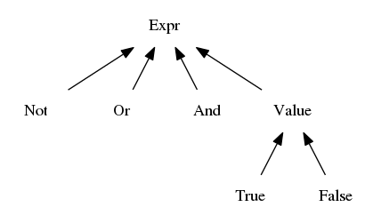 We continue by creating the classes True, False, Not,:code:And, and Or which all implement the empty marker interface Expr. The classes True and False just stay empty but the other three contain private fields representing the according subexpressions. It is good practice to mark these private fields as final. This allows us to reuse expressions without having to worry that they might change accidentally.